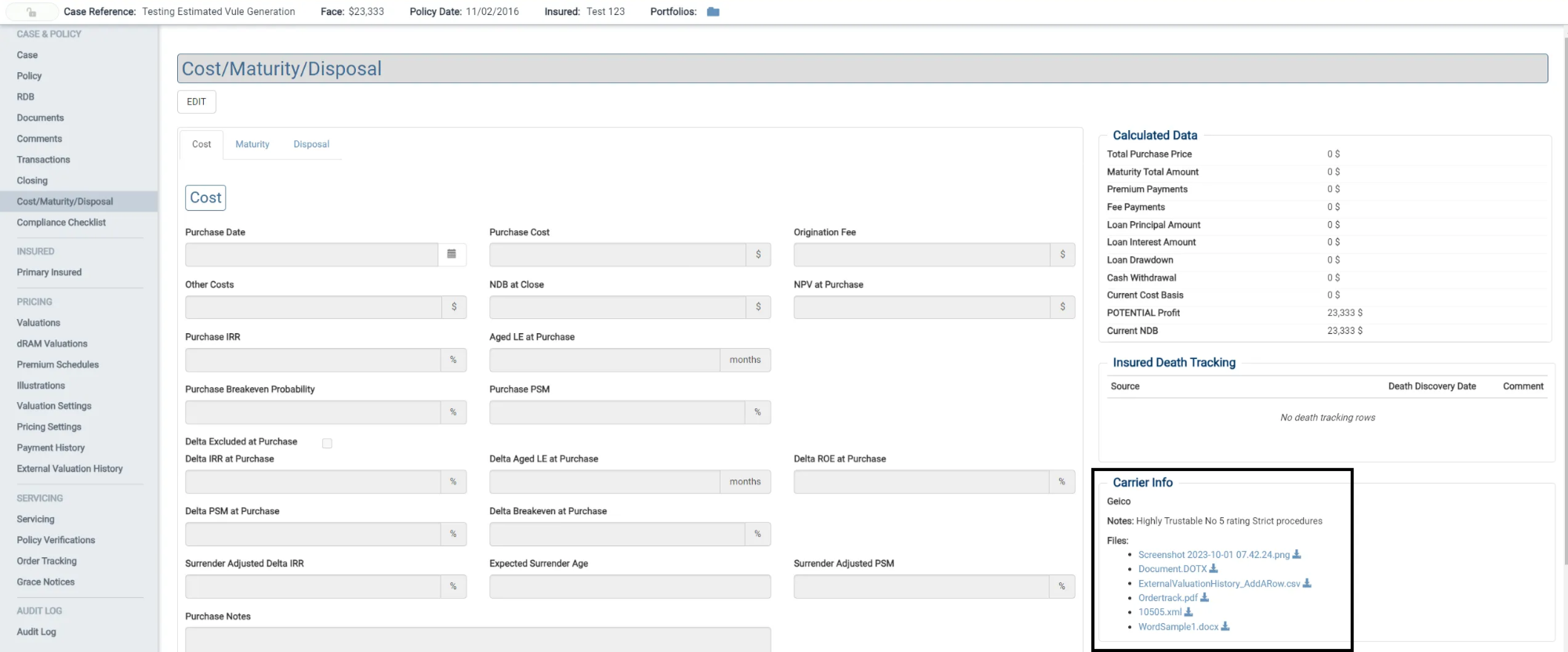 Example of Carrier Info display on Cost/Maturity/Disposal tab