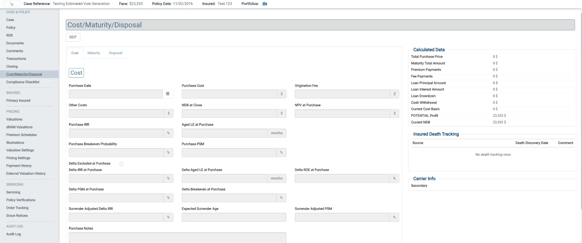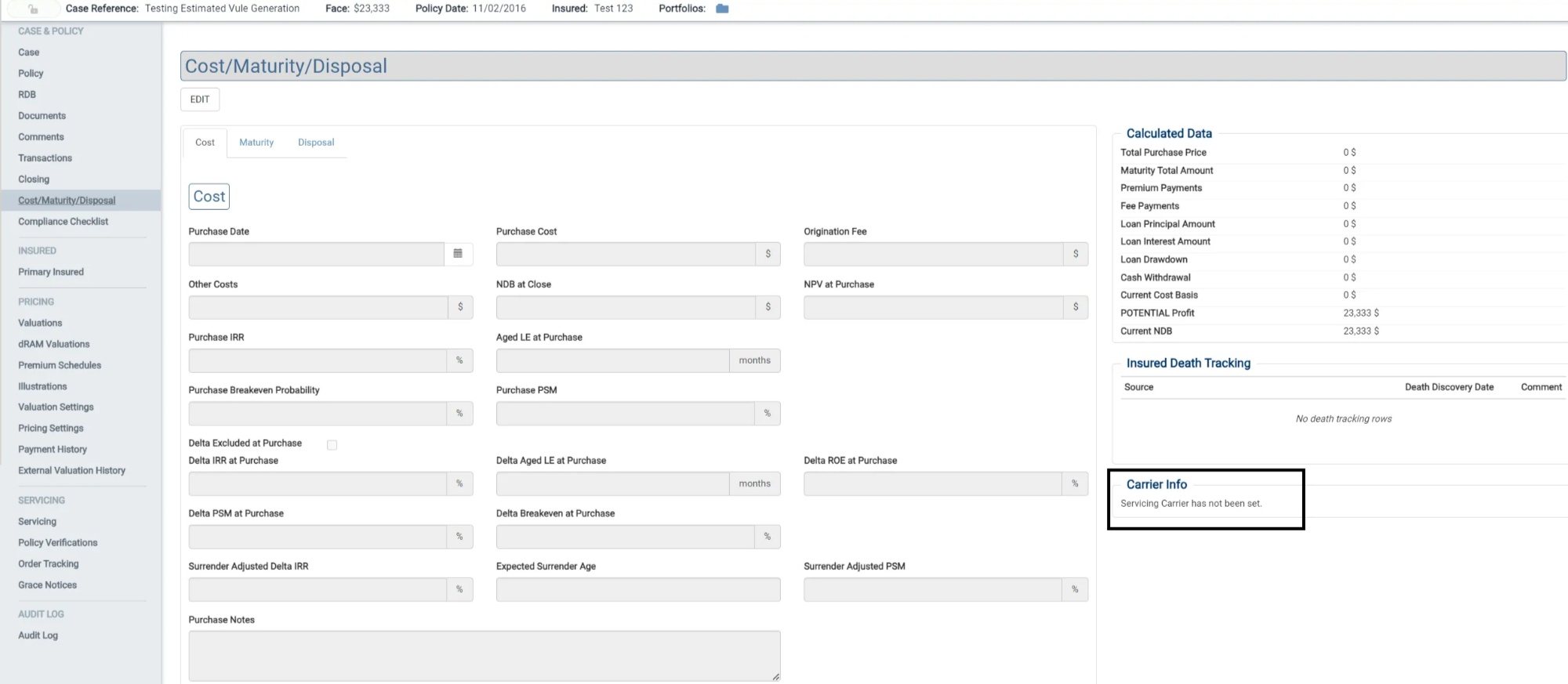 Servicing carrier should be set on servicing tab to view the carrier information on Cost/Maturity/Disposal tab