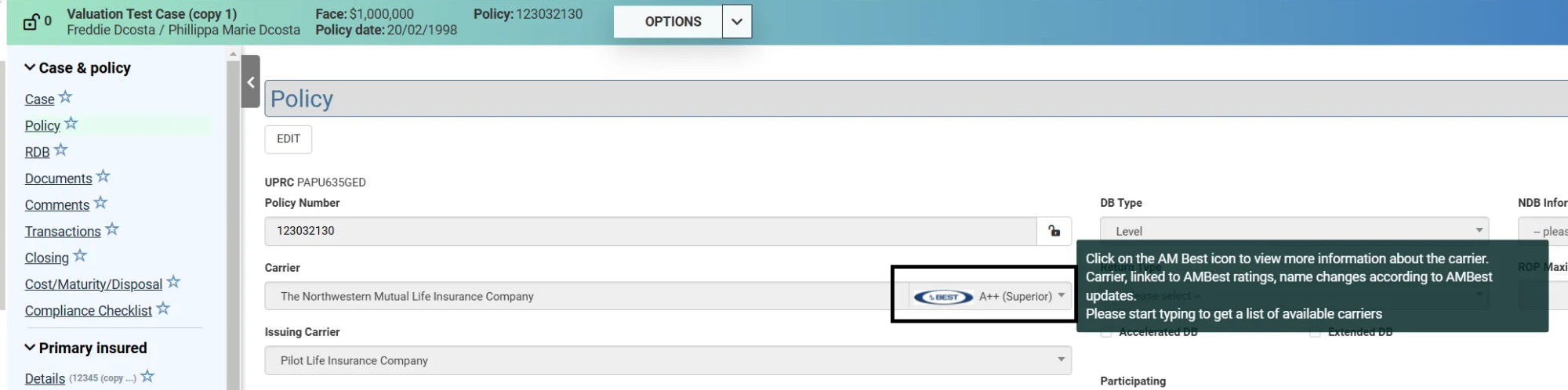 The ratings come from AMBest, as illustrated by the logo on the Policy tab.