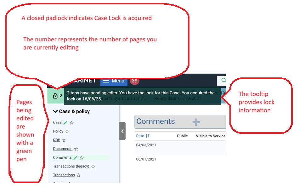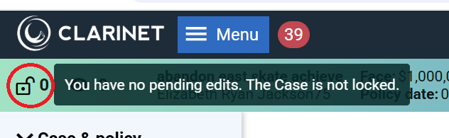 The padlock symbol in the top left corner indicates whether a Case is locked or unlocked and hovering over the padlock displays a tooltip providing information as to whether any edits are pending and further lock information.