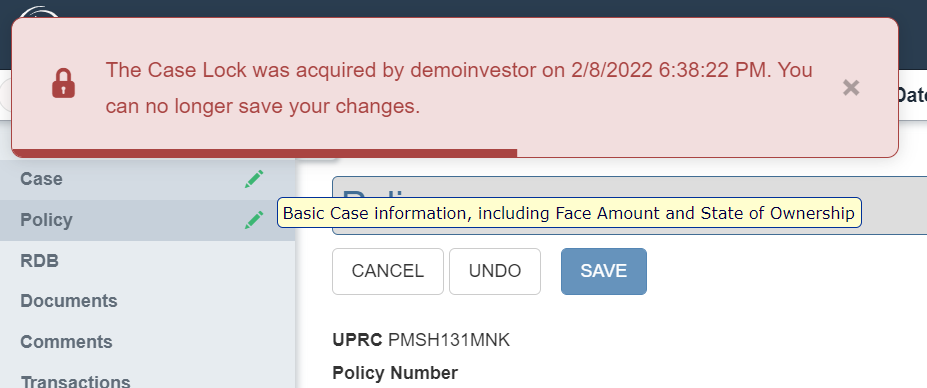 The other user's screen will update to have the red background in the case bar and the tooltip will show information about the user who has now acquired the Case Lock.