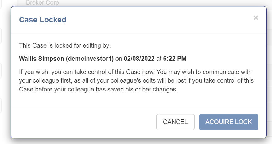 If you do decide to click ACQUIRE LOCK the other user is immediately notified and will no longer be able to save their pending changes, effectively all their changes are lost.