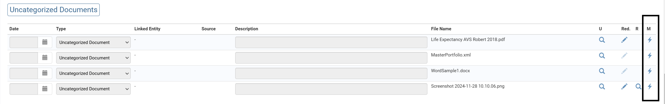 Once this has been saved, the Uncategorized Documents list will have a new row for the uploaded Document. You will see a new icon on the far right (highlighted in black below). Clicking this will bring up a confirmation message, asking you to confirm the document is an LE Report. Click “OK”. At the end of document mining, new LE Report will be added to the Insured details page (LE Reports tab).