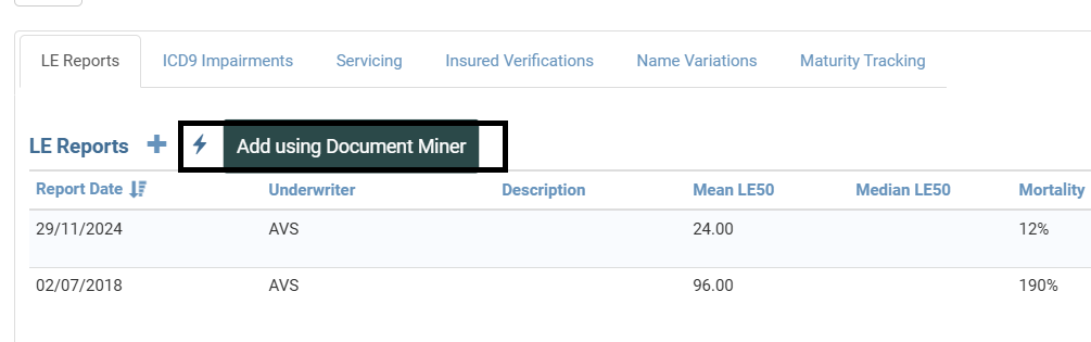 On Insured, LE Report tab, you have the document miner icon as shown in the screenshot below.