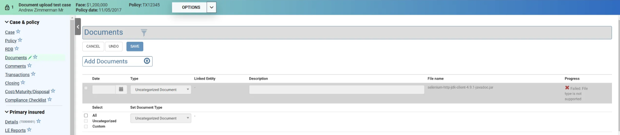 The Type dropdown menu allows you to assign a document type. The document types available in the dropdown are dependent on the category of document, i.e. whether Case, Policy, Illustration, Primary or Secondary Insured or Closing. Additionally, a document can be Uncategorized.