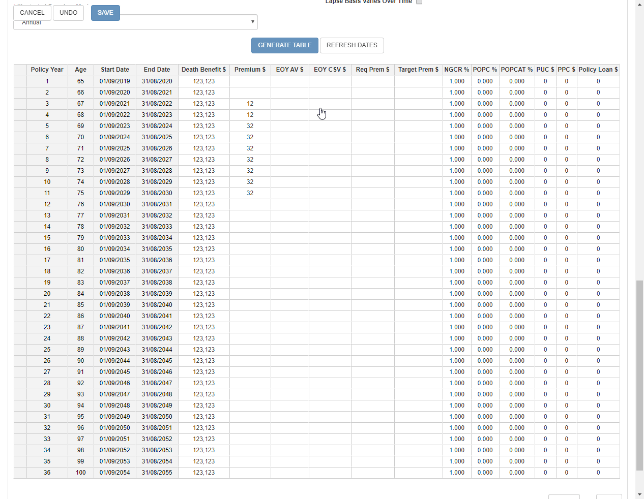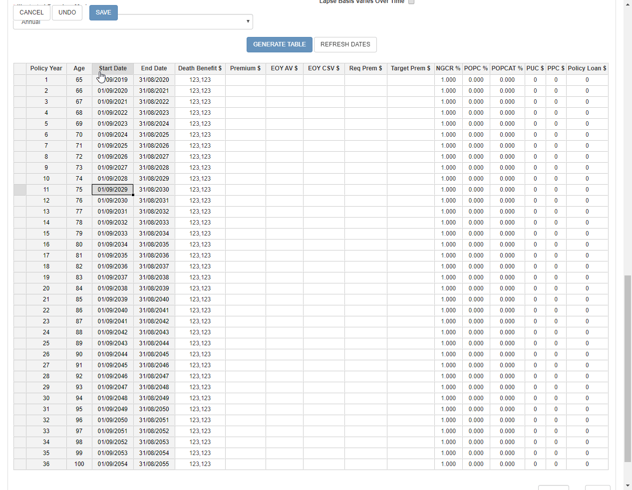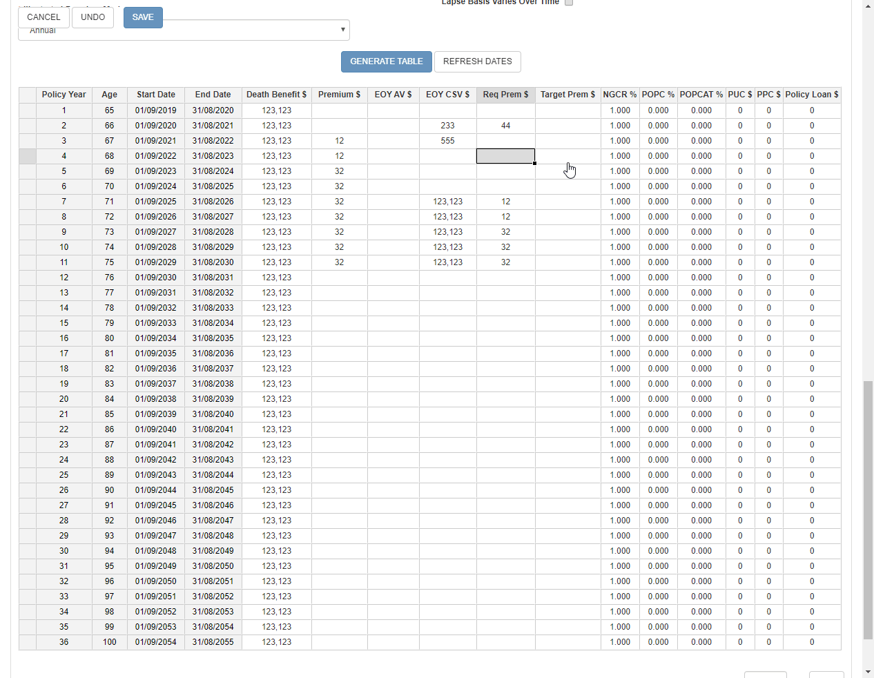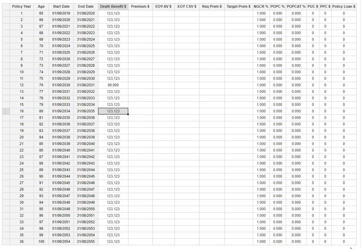 In the edit mode, editable cells have a white background, as in Excel. The headers and row selectors (the empty grey square at the beginning of each row) cannot be edited. Further, some tables may contain cells that cannot be edited because they are calculated, such as Policy Year or Insured Age in an Illustration table. Note that even if these cells are read-only, they can still be part of a selection and copied to the clipboard. However, pasting will have no effect on them.