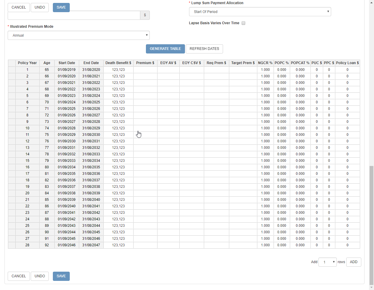 You can add a new row by right clicking on the row selector (the grey square at the beginning of each row) and then selecting "Insert a new row before" or "Insert a new row after", which will add a new row either before or after the selected row. In the case of the Illustration page, this new row will be given a Policy Year, Age, Start Date and End Date automatically.
