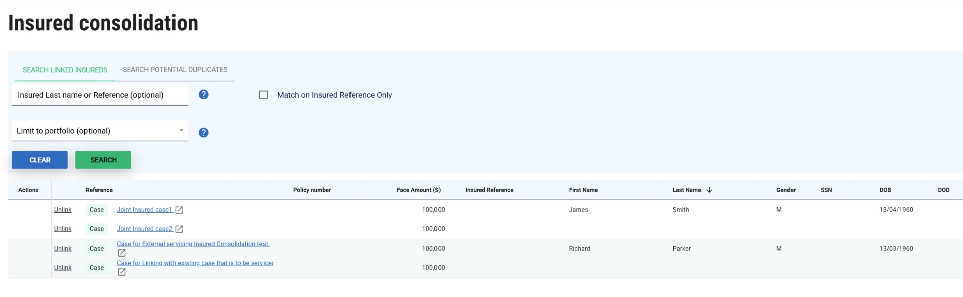 This topic explains how to link and unlink Insureds in ClariNet LS. When you first create or receive a Case in ClariNet LS, the Insured is treated as a new individual, regardless of whether his or her name, date of birth and/or SSN match any other Insureds in ClariNet LS. Links with existing Insureds can be created through Insured Consolidation.