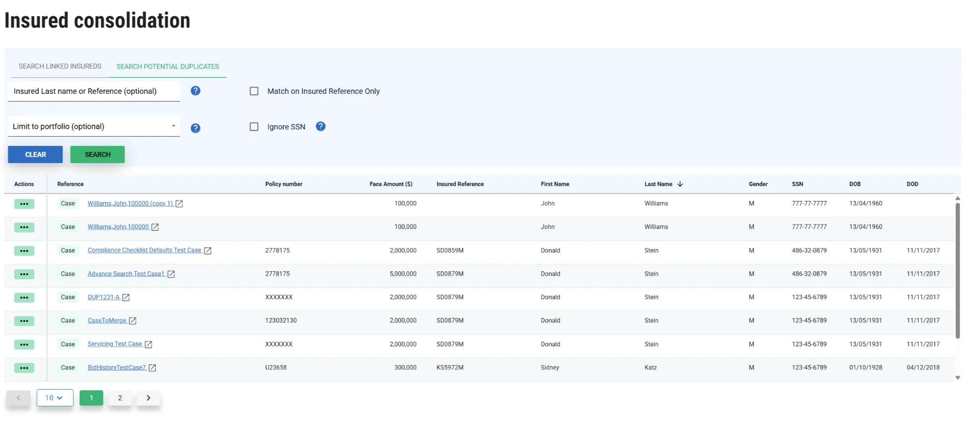 - Search Potential Duplicates lists all Cases where one of the Insureds may match an Insured in another Case (see below what the matching rules are, based on gender, insured reference, name, SSN and DOB).