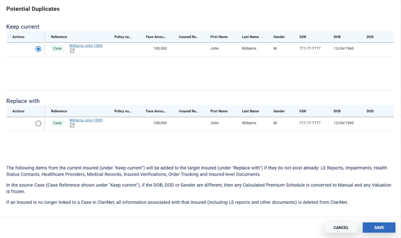 Once an Insured has been consolidated across multiple Cases, any changes made to that Insured in one Case will automatically appear in the other Case (there is only one Insured, all Cases point to it). This applies to all Insured information and all objects linked to that Insured, including LE reports, Insured Verifications, Health Status Tracking, Health Status Contacts, Healthcare Providers, ICD-9 Codes and Medical Records/HIPAA Releases.