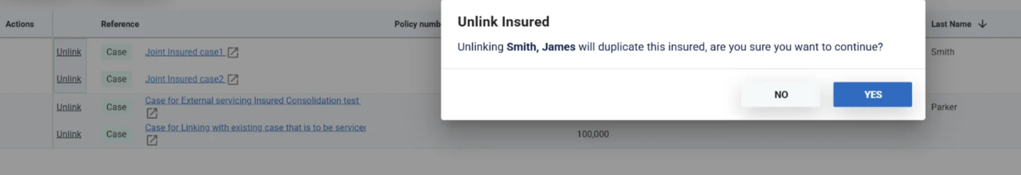 If you wish to unlink Insureds across Cases, click on the “Unlink” link next to the relevant Case. This displays a pop-up warning: