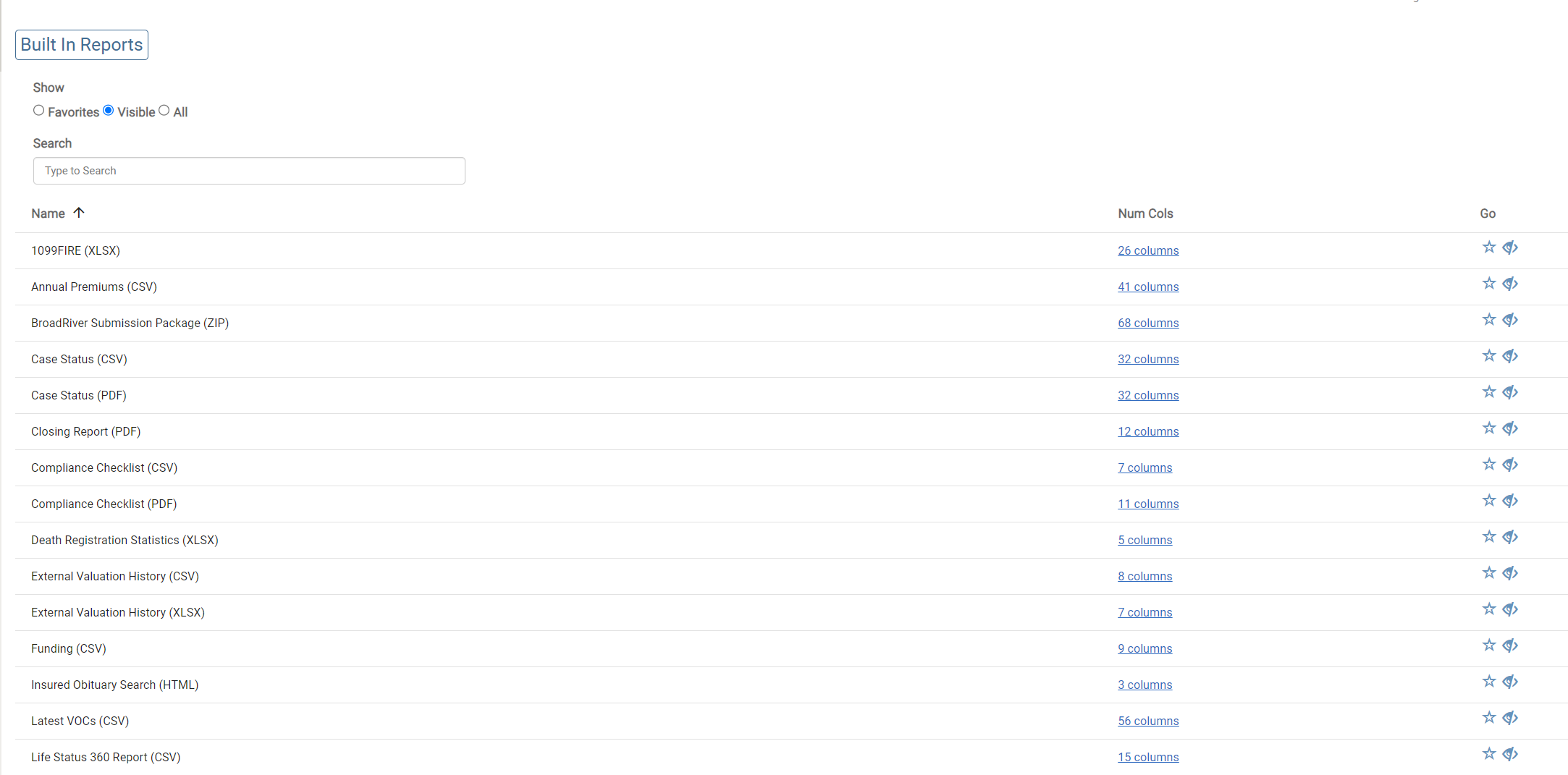 Case Status (CSV & PDF)Information about the case: Case Reference , Status (Active/ Not Active), Broker, Carrier, Seller, Policy Type, Policy Number, State, Face Amount, Issue Date, SSN, LE50 (21st/AVs/EMSI/Fasano/ISC/LSI/Predictive/Elevation/Lapetus/Polaris/User Define)N/A