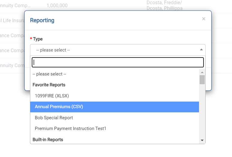 Annual Premium (CSV)The Annual Premium is the future expected Premium Schedules for each case in a portfolio, from Year 1 (Policy Date) to Coverage End Date. It contains 41 columns as listed above under The list of Built-in Reports are : Annual Premiums (CSV).N/A