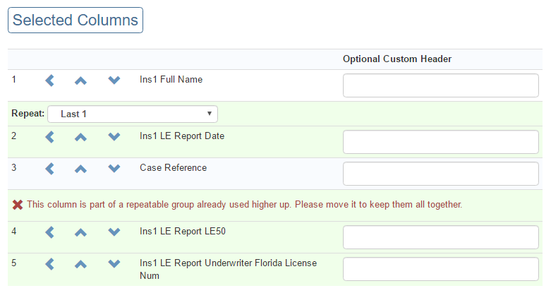 Some Case objects can be represented multiple times, such as LE Reports. We refer to these as "Repeatable Groups". When you add a column which forms part of one of these groups, it appears with a green border and an additional parameter at the top: