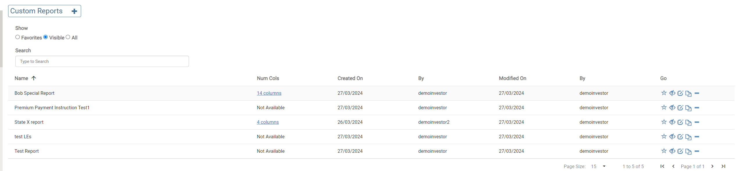 Adding or editing the contents of a Custom Report is done by clicking the Edit icon under the Go column, which opens the Custom Report page.