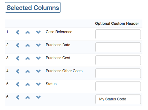 You can reorder fields using the Up and Down icons and delete a field from the Selected Columns by clicking on the Remove icon. You can enter a custom title for each row/column in the Optional Custom Header field (the default title is the field name, e.g., "Case Reference" , "Purchase Date").