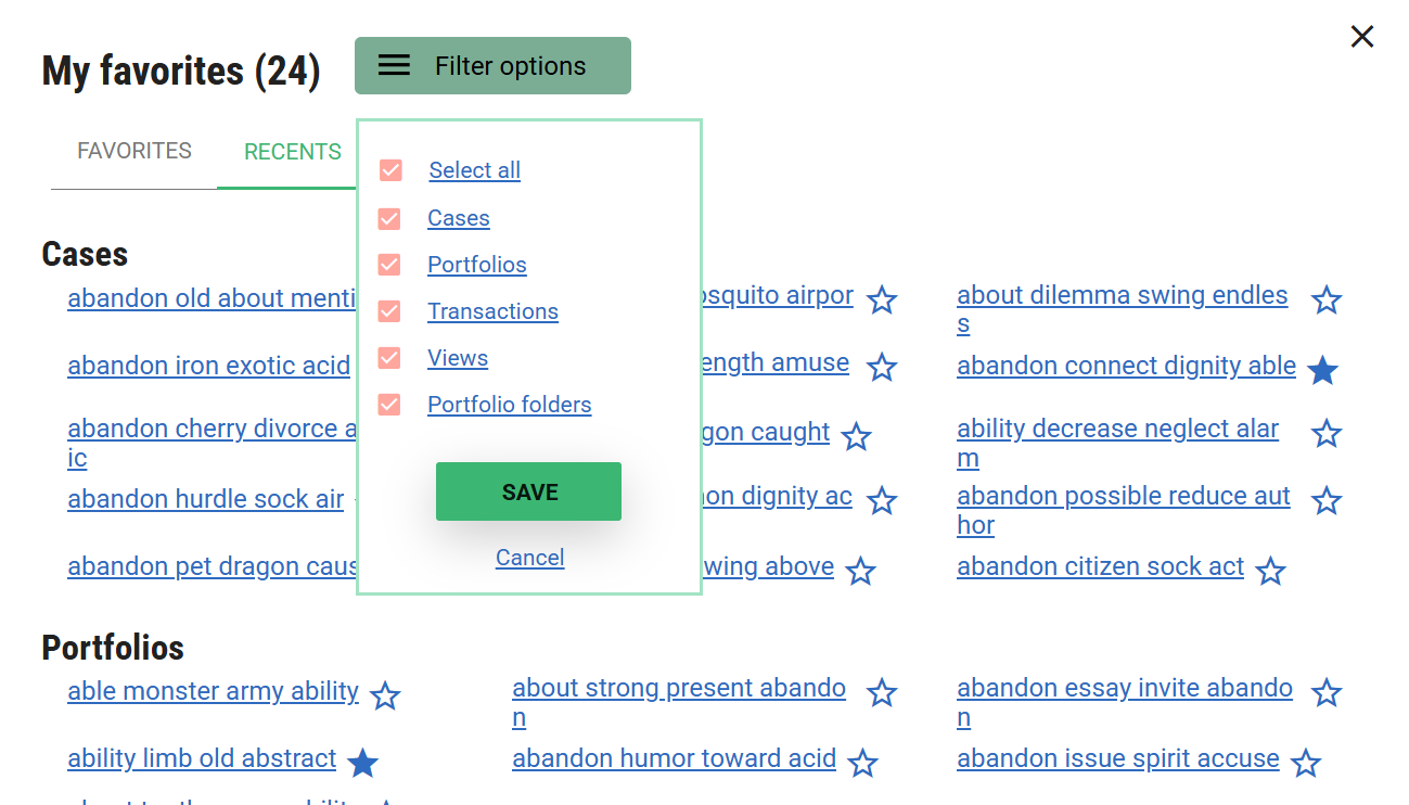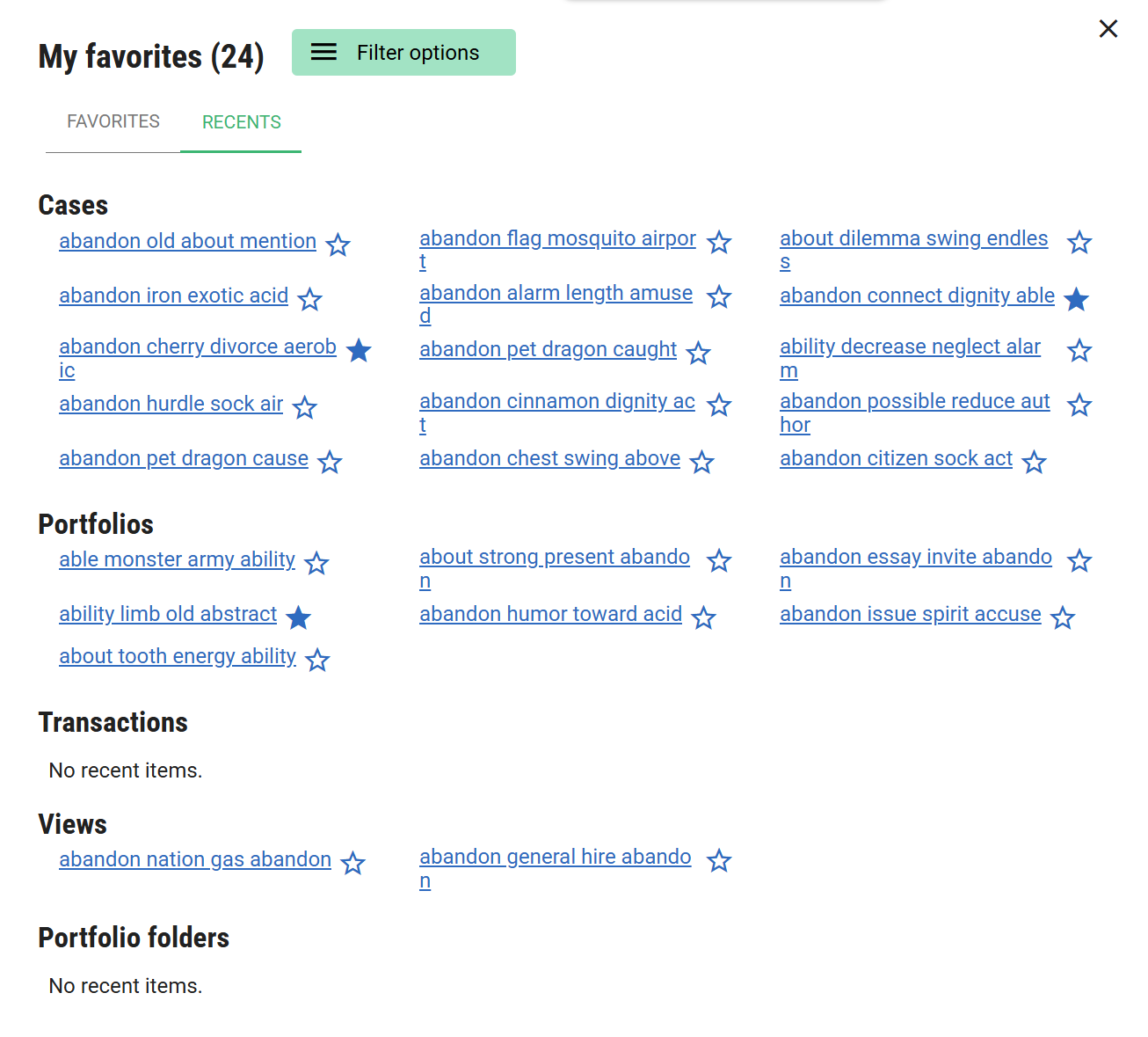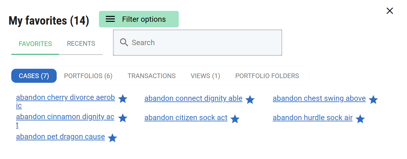When you visit any of the above items (Cases, Portfolios, Transactions, Views, or Portfolio folders), the recently visited items appear in your Recent tab.