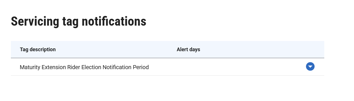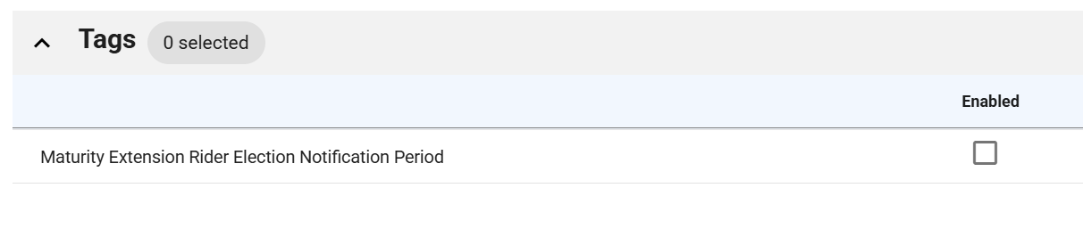 For Maturity Extension Rider Election notifications, the Maturity Extension tag is added when the deadline approaches for the Maturity Extension Rider Election Date of the Policy. This can be anywhere from 180 days to 1 day before the Election Date, based on the Alert days set.