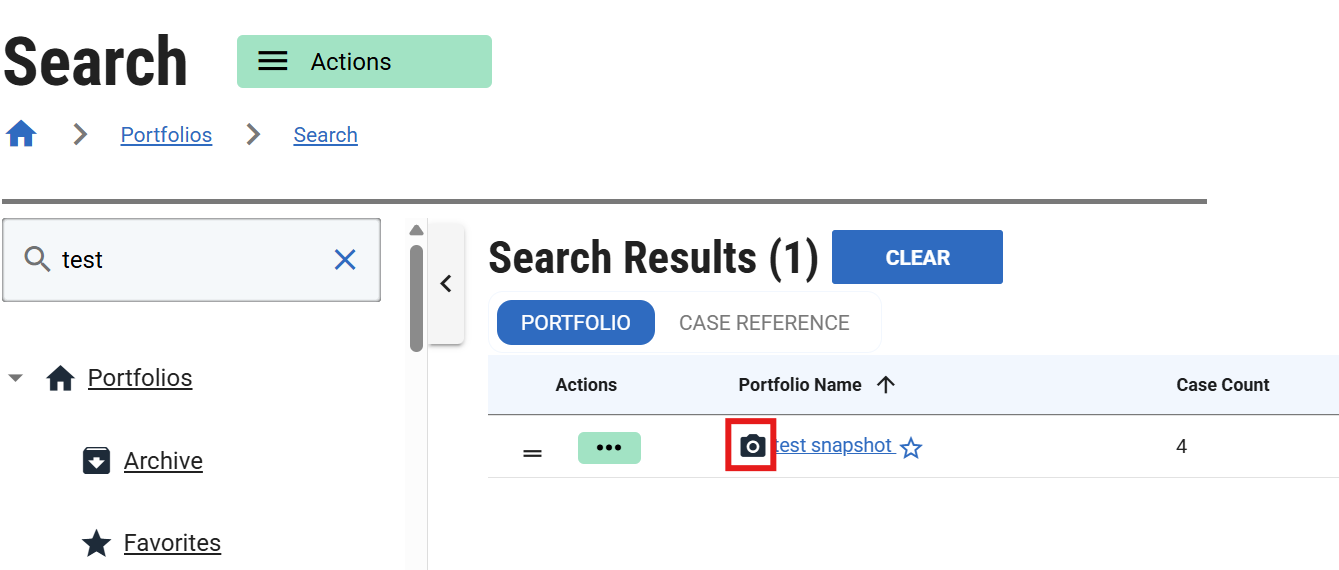 Snapshots can also be found using the search functionality of the Portfolio list page. Snapshots will appear with a camera icon next to them.