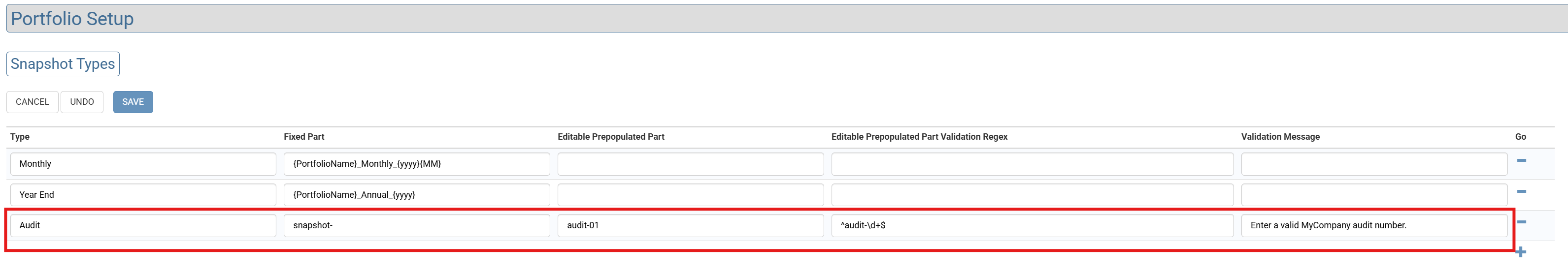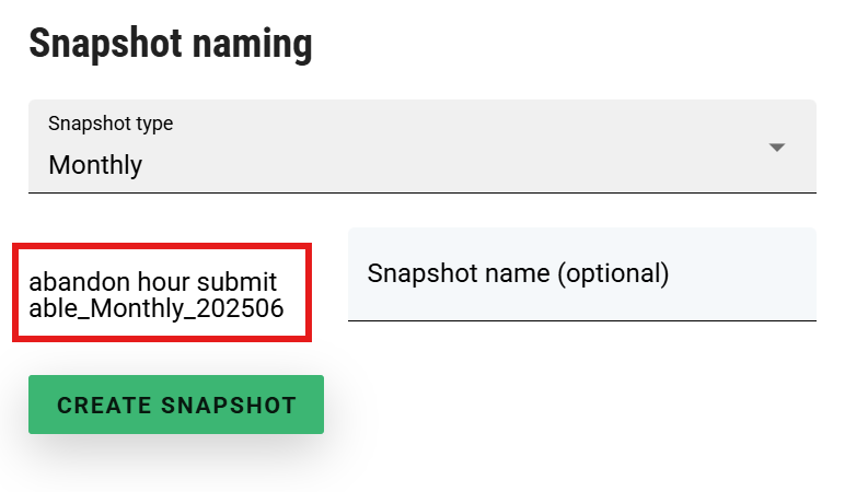 For example, given a Fixed value of {PortfolioName}_Monthly_{yyyy}{MM}, a user would see the following on Snapshot creation for that particular Snapshot type: