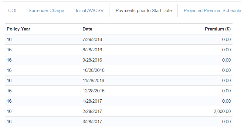 Here, we’ve added a lump sum payment on 28-Feb-2017 of $2,000. This removes the following two premium payments and slightly reduces the following payments. The lump sum payment is noted in the payments prior to Start Date:
