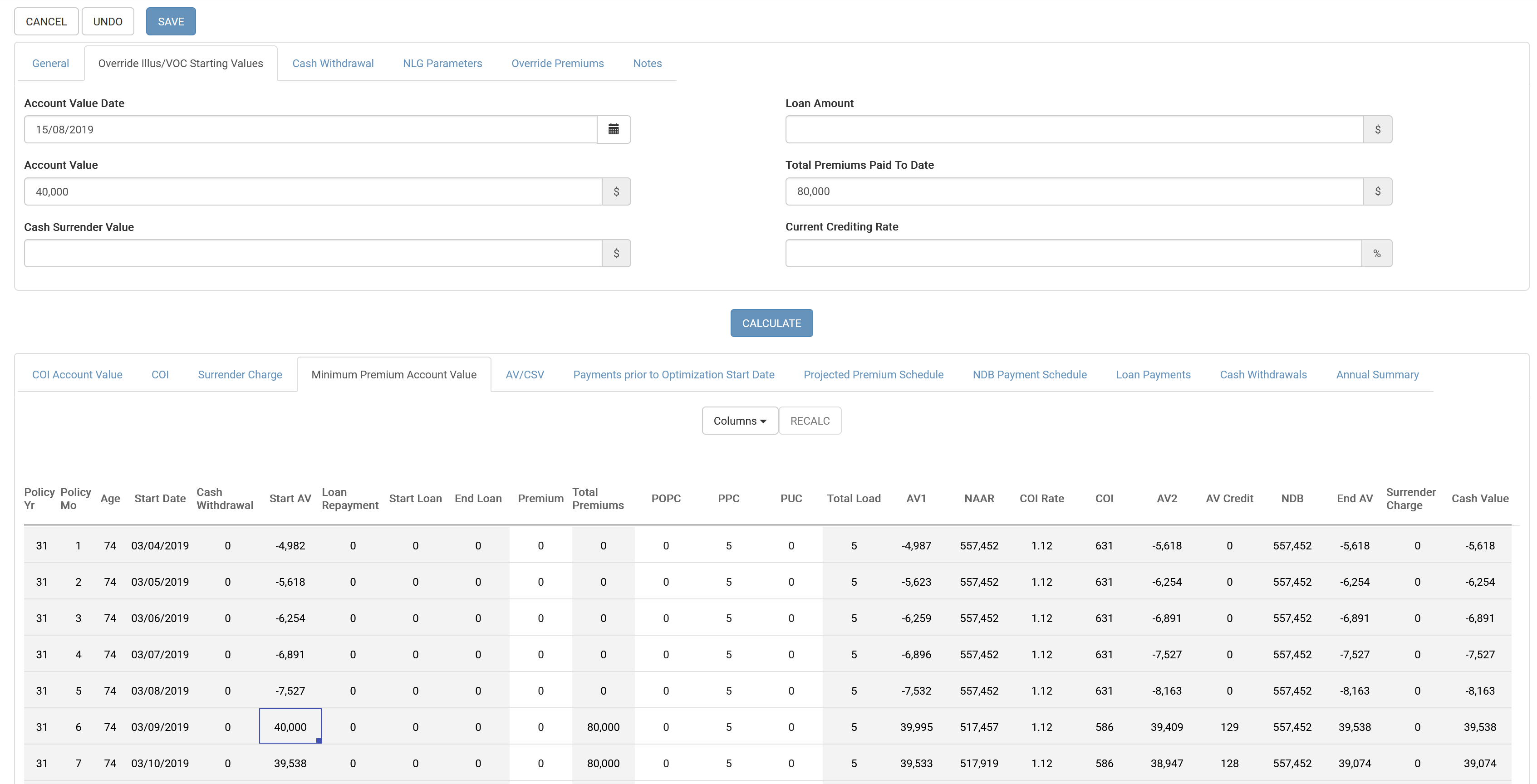 You can find the overrides on the “Override Illus/VOC Starting Values” tab of the premium calculator. In the following example, you can see the Account Value and Total Premiums Paid To Date fields have been overridden. The Minimum Premium Account Value tab shows these taking affect in year 31, month 6 which is the policy monthiversary after the overridden account value date.