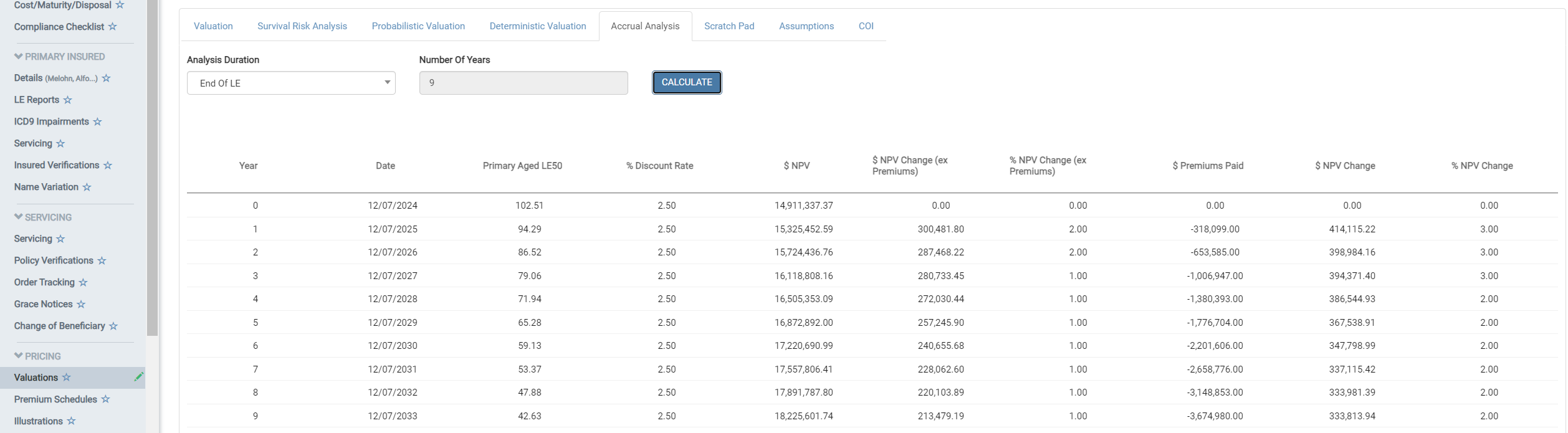 ClariNet LS Provides the ability to analyze how the value of a policy evolves over time. Based on the current premium schedule and the survival curve, the model projects forward in time to look at the point at which the premium payments begin to make the policy unviable.