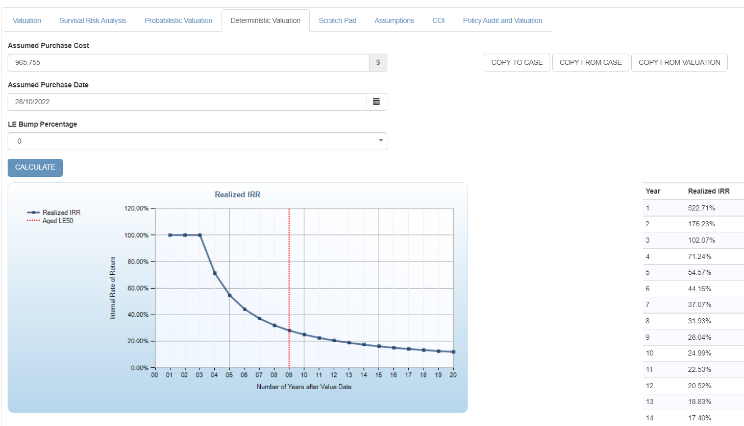- Deterministic (Individual LE): a date of death is calculated based on the blended underwriting date plus the blended LE50. For a joint life policy, either the earlier or later of these dates is used depending on the joint life payout type. Note that this type of valuation implies “straight aging” and will therefore lead to high valuations;