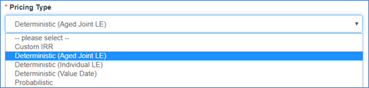 - Deterministic (Aged Joint LE): an aged LE50 is calculated on Value Date (joint if this is a joint life policy) and the date of death is calculated based on Value Date + Aged LE50;