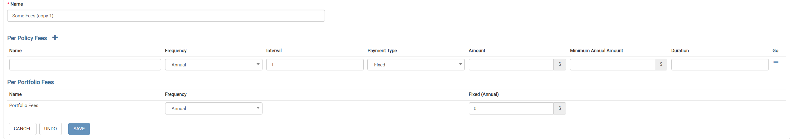 A fixed amount of fees for the entire portfolio can be specified. This is useful where the fee amount is independent of the number of outstanding policies in the portfolio.
