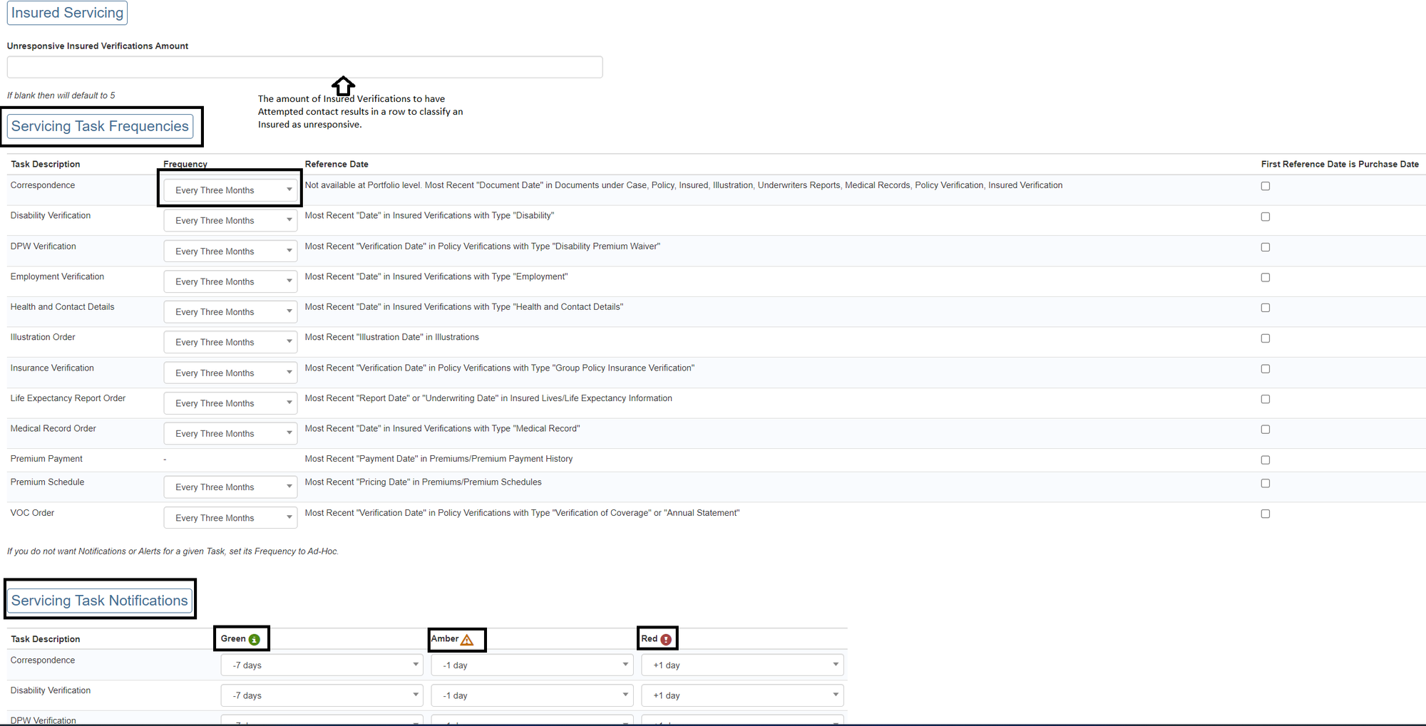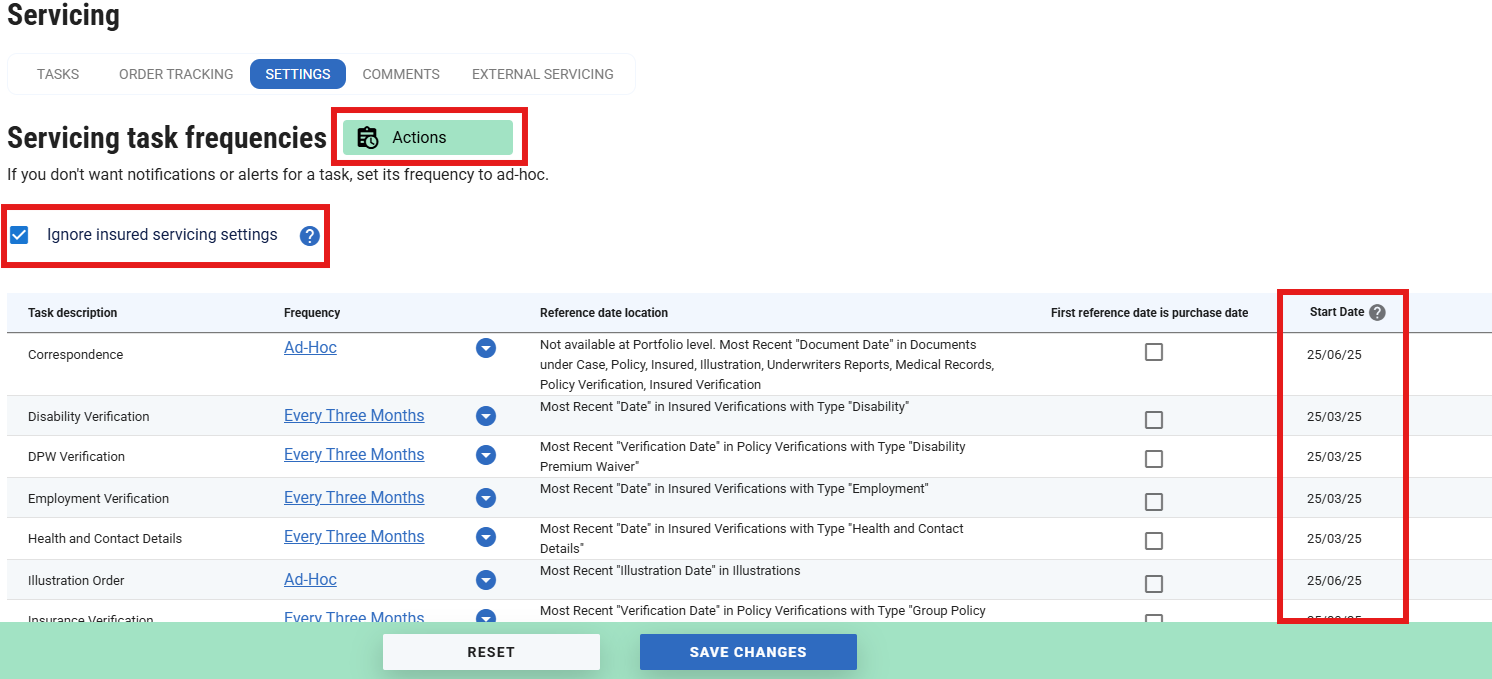 Setting the servicing task frequencies can be done from the Settings page/ Portfolio List page/ Insured Servicing Settings page (case level).