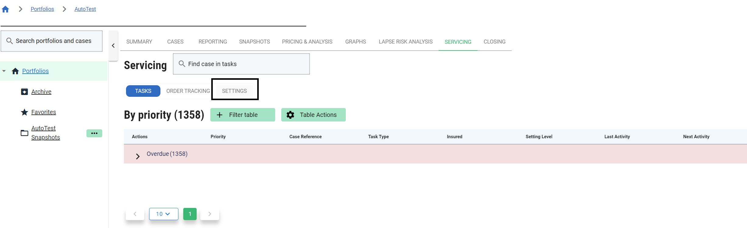 This page allows you to view and take action on Servicing Tasks for Cases contained within each Portfolio. It is accessed from the Portfolio list page.