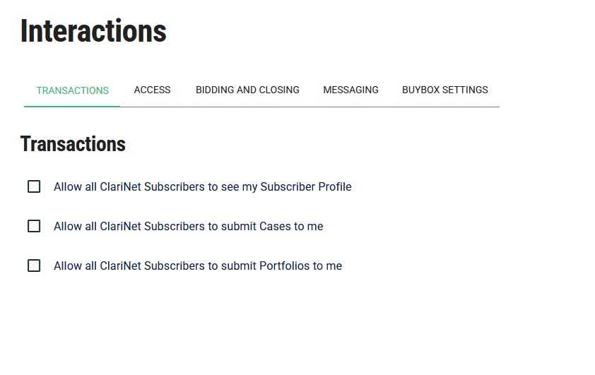 The Transactions tab has several checkboxes. These are “global” settings and affect the degree to which all ClariNet LS clients can view your information and send Cases to you: