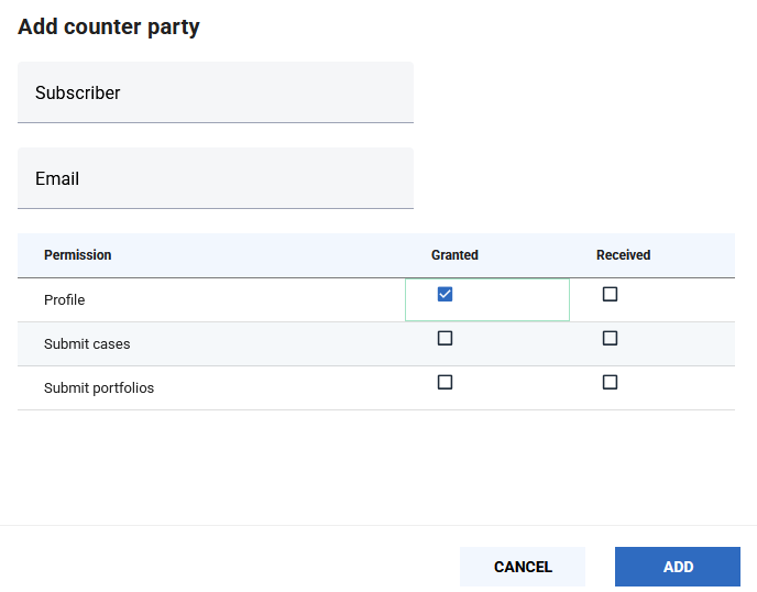 - Check the boxes under the Granted column for the Permissions you wish to grant and check the boxes under the Received column for the Permissions you wish to receive from the other Subscriber.
