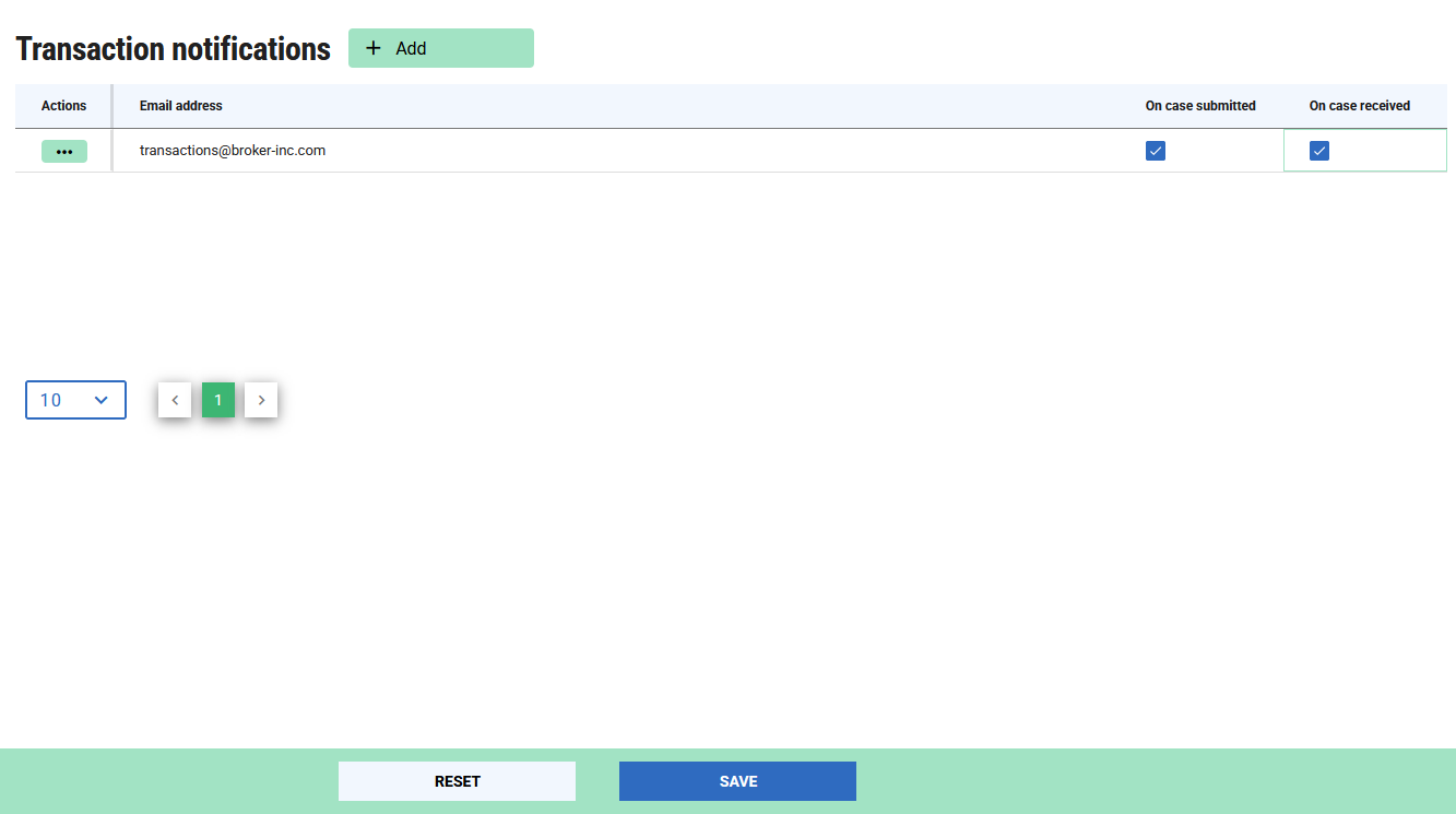 A new notification email address can be added by clicking the + Add button in the header: